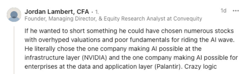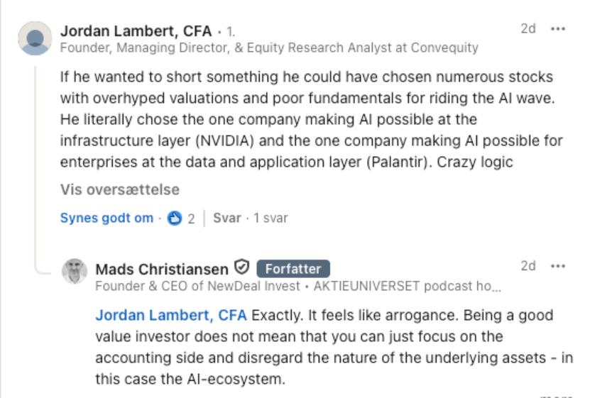 Michael Burry er god til regnskaber og pengestrømme – om han ved meget om teknologi skal jeg ikke kunne gøre mig til dommer over. CFA Jordan Lambert, (der er en del af vores porteføljeteam) skrev en kommentar på Linkedin, som satte hovedet på sømmet: