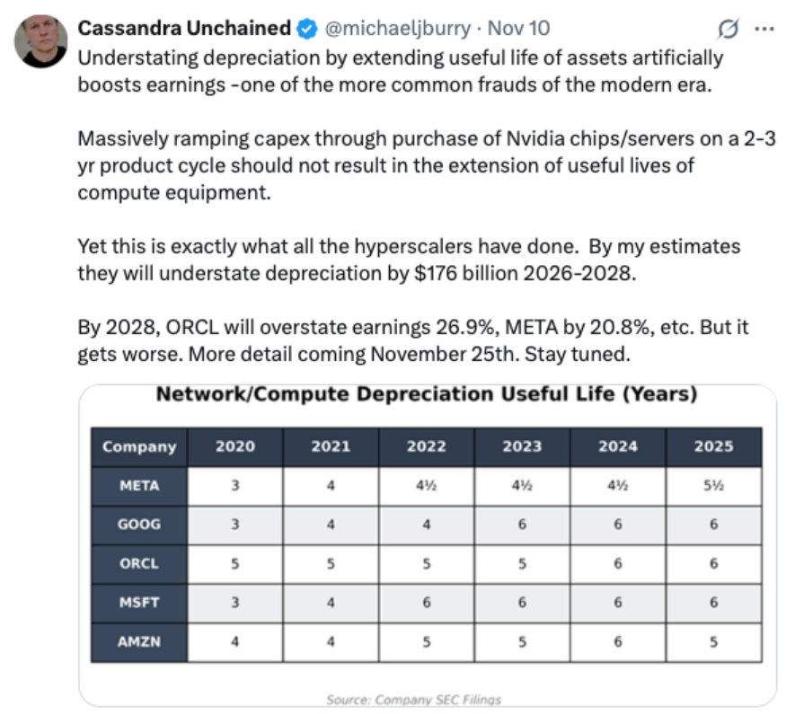 Michael Burry skriver: “At nedsætte afskrivningerne ved at forlænge aktivers regnskabsmæssige levetid booster virksomhedernes (MAG7) overskud på en kunstig måde”