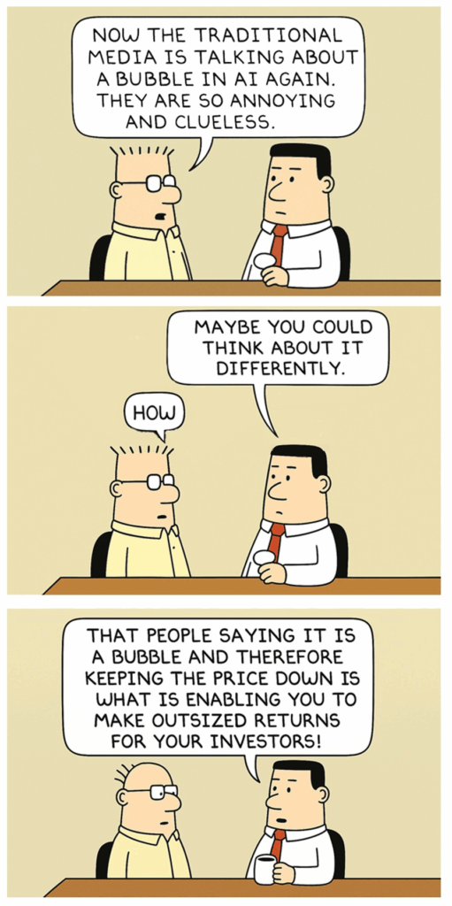 Lige nu handler teorierne om en boble i AI. Men, da regnskaberne har været super gode og der nok næppe til syvende og sidst er ret mange, som tror på at AI ikke er en transformerende teknologi er det svært at se markedet undervurdere teknologiaktier så voldsomt som i 2022 og april 2025. Jeg mener ligsom jeg gjorde i 2022 og april 2025, at denne opfattelse af AI er hamrende forkert (og et tegn på manglende teknologisk indsigt).